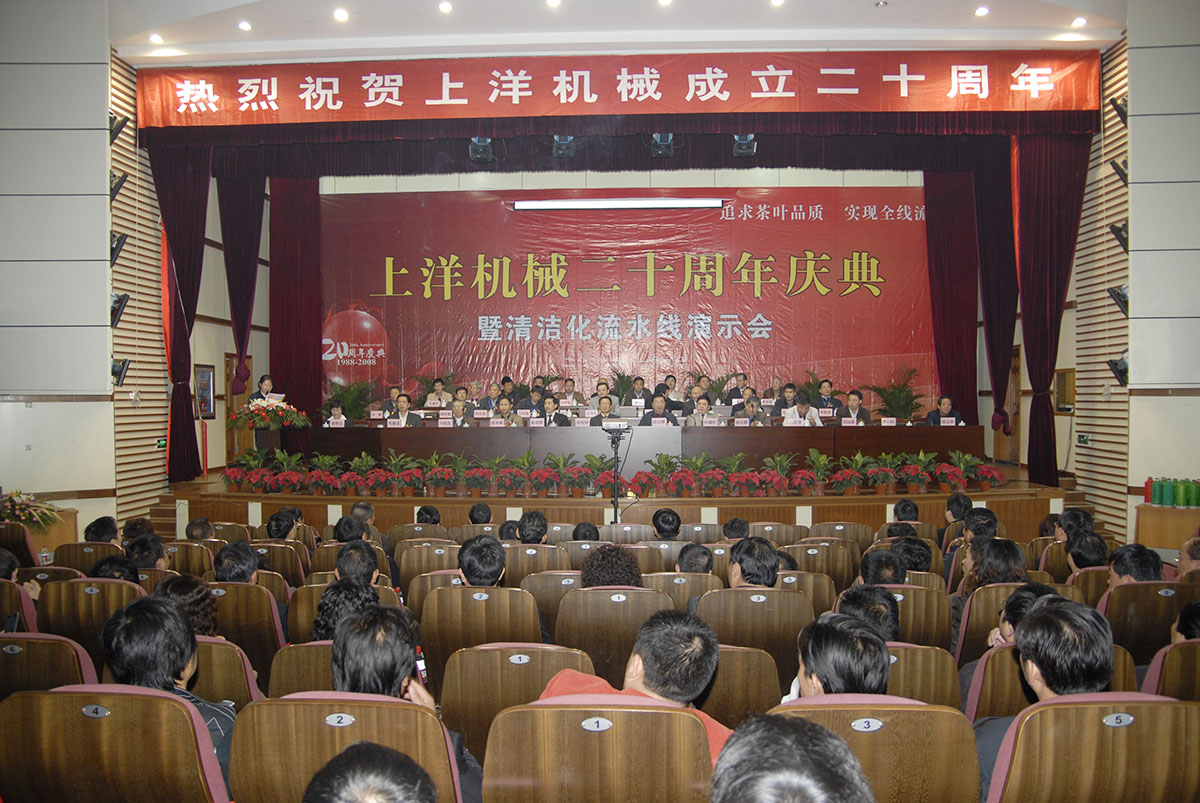 • 2008年,企業喜遷辦公大樓,上洋二十周年慶典隆重召開,來自社會各界領導及茶界專家、客戶共600余人參會。企業以“使清潔化更清潔,讓流水線流起來”為理念,引導茶加工產業發展新潮流,標志著公司在發展進程中邁出新的一步。