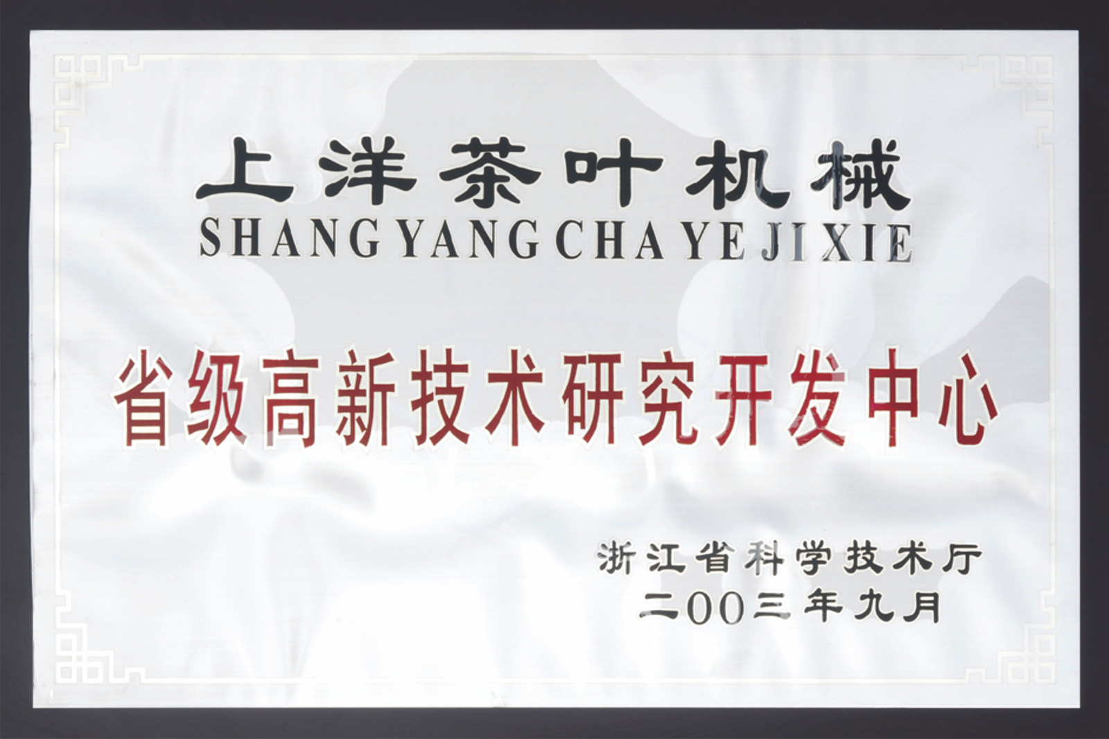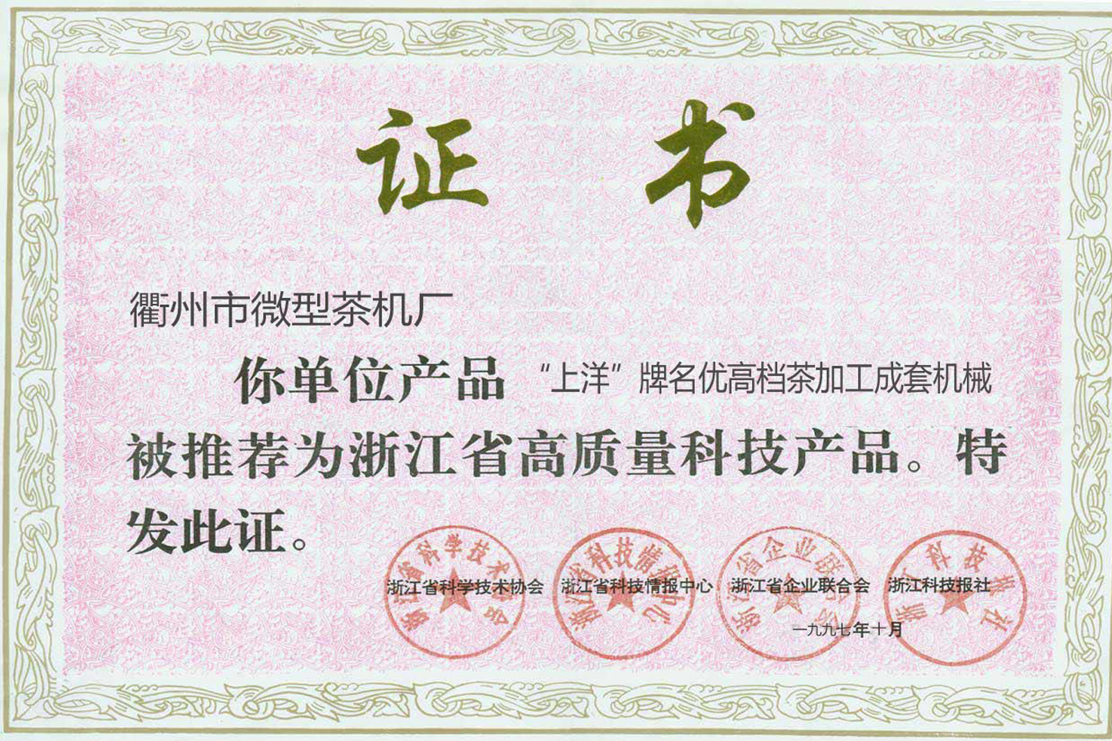 • 1997年10月,“上洋”牌名優高檔茶加工成套機械被評為浙江省高質量科技產品。